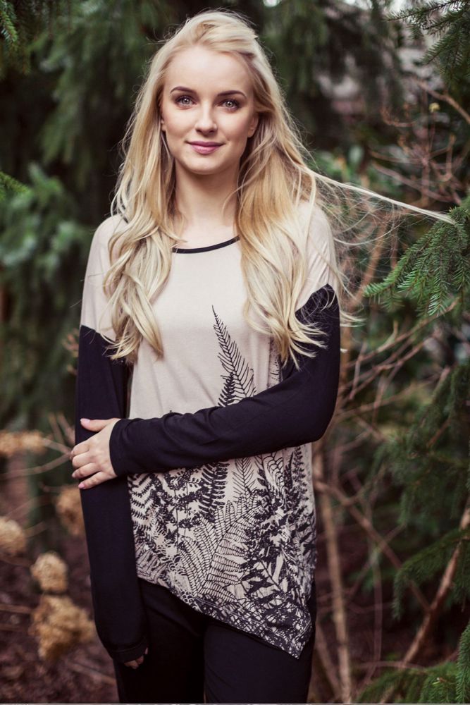 Dámské designové pyžamo nebo domácí oblečení s dlouhými rukávy a aplikací na horním atypicky ušitým dílem a dlouhými jednobarevnými kalhotami. Baleno v transparentním obalu.