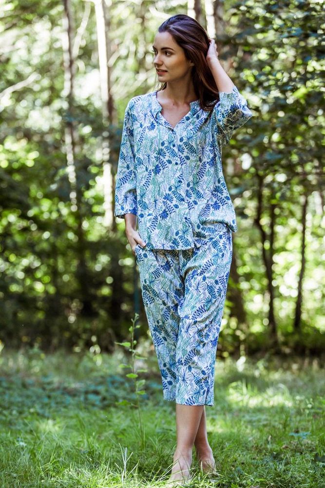 Dámské propínací pyžamo s 3/4 rukávy i nohavicemi s aplikací stylového celopotisku. Baleno v transparentním obalu.