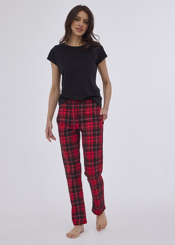 Dámské bavlněné samostatné pyžamové kalhoty vhodné i pro běžné domácí nošení v různých barevných provedeních a vzorech, s kapsami a uvazováním na šňůrku. Baleny v sáčku.