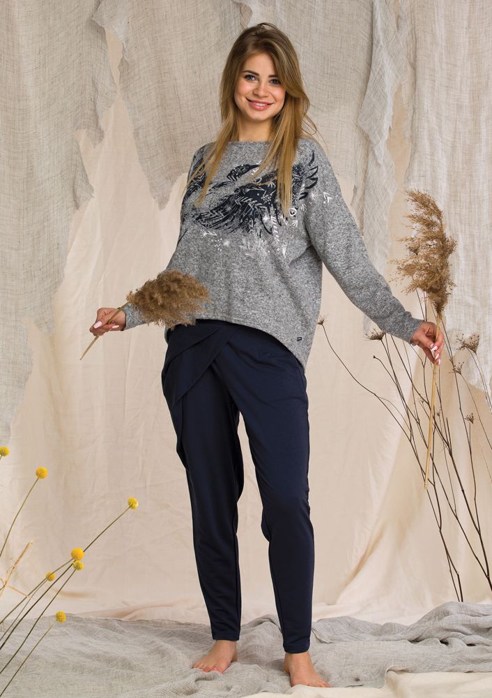Dámský model domácího oblečení s dlouhými rukávy, stylovou aplikací a jednobarevnými, extravagantně střiženými kalhotami. Baleno v transparentním obalu.