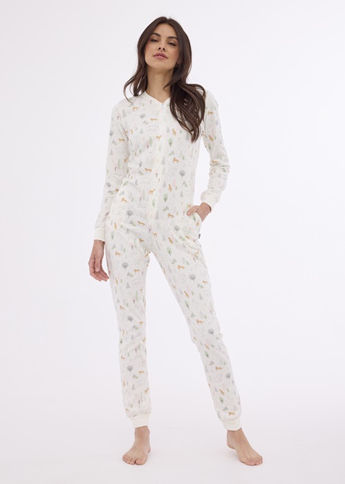 Oblíbený dámský model vzorovaného overalu vyrobeného z kvalitní bavlny. Rukávy a nohavice zakončeny úpletem. Zapínaní na zip. Baleno v dárkové krabičce.