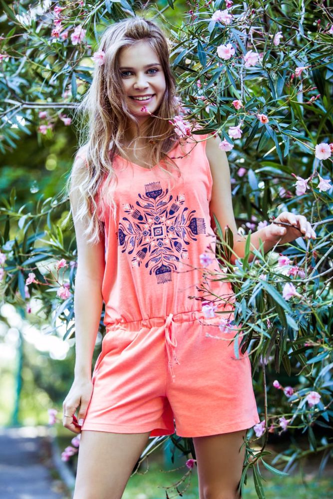 Dámský stylový letní overal na ramínka s aplikací na horním dílu, kapsami a uvazováním v pase. Baleno v transparentním obalu.