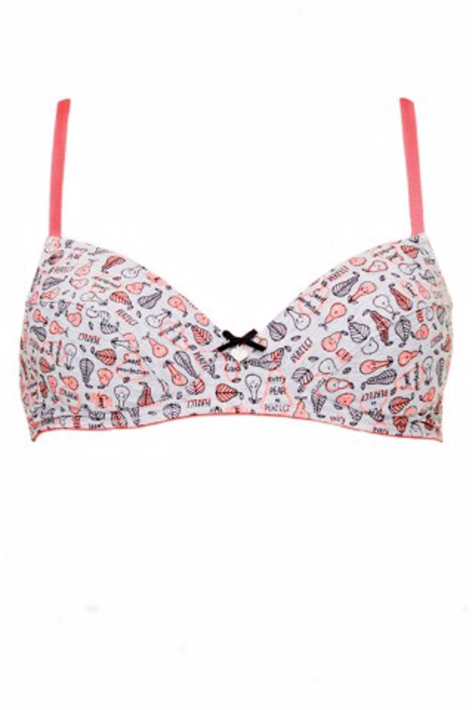 Dívčí vzorovaná lehce vystužená podprsenka s mašličkou mezi košíčky. Balena v krabičce.