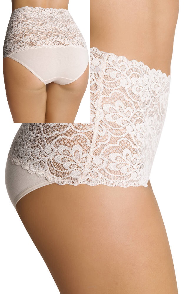 Dámské kalhotky jsou ušité z pevné krajky se zvýšenou linií pasu a tím napomáhají ke zpevnění v oblasti břicha, zadečku a boků. Vnitřní část rozkroku kalhotek je podšita bavlněnou látkou. Baleno v krabičce.