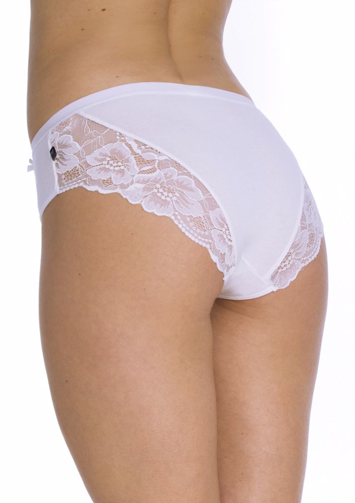 Dámské kalhotky, které jsou vyrobené z měkké bavlny. Kalhotky mají vysoký pas a na bocích jsou plnější. Zadní díl modelu zdobí ažurová krajka s květinovým motivem. Kalhotky mají v pase pohodlnou plochou gumu. Baleno v krabičce.