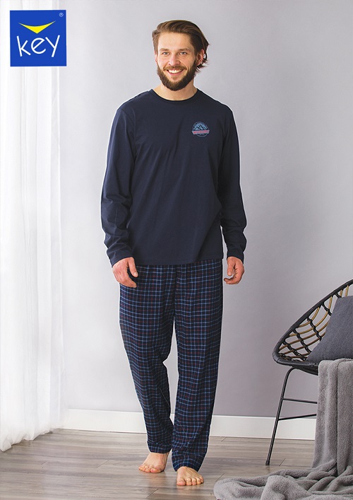 Pánské pyžamo s dlouhými rukávy, decentním potiskem, kulatým výstřihem a károvanými volnými kalhotami s kapsami. Baleno v transparentním obalu.