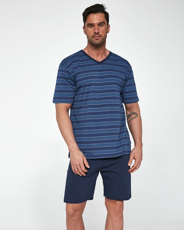Pánské pyžamo vyrobeno z kvalitní bavlny. Horní díl s výstřihem do véčka a krátkými rukávy. Jednobarevné krátké kalhoty. Baleno ve stylové krabičce.