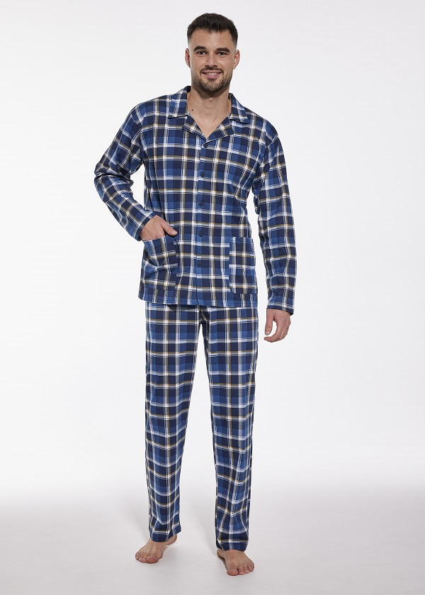 Pánské pyžamo vyrobeno z velmi kvalitní bavlny. Károvaná blůza s dlouhým rukávem se zapínáním na knoflíky límečkem a kapsičkou. Dlouhé volné kárované kalhoty. Pyžamo je baleno ve stylové dárkové krabici.